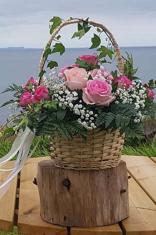 Wicker baskets used for the floral arrangements vary in design depending on what is available.